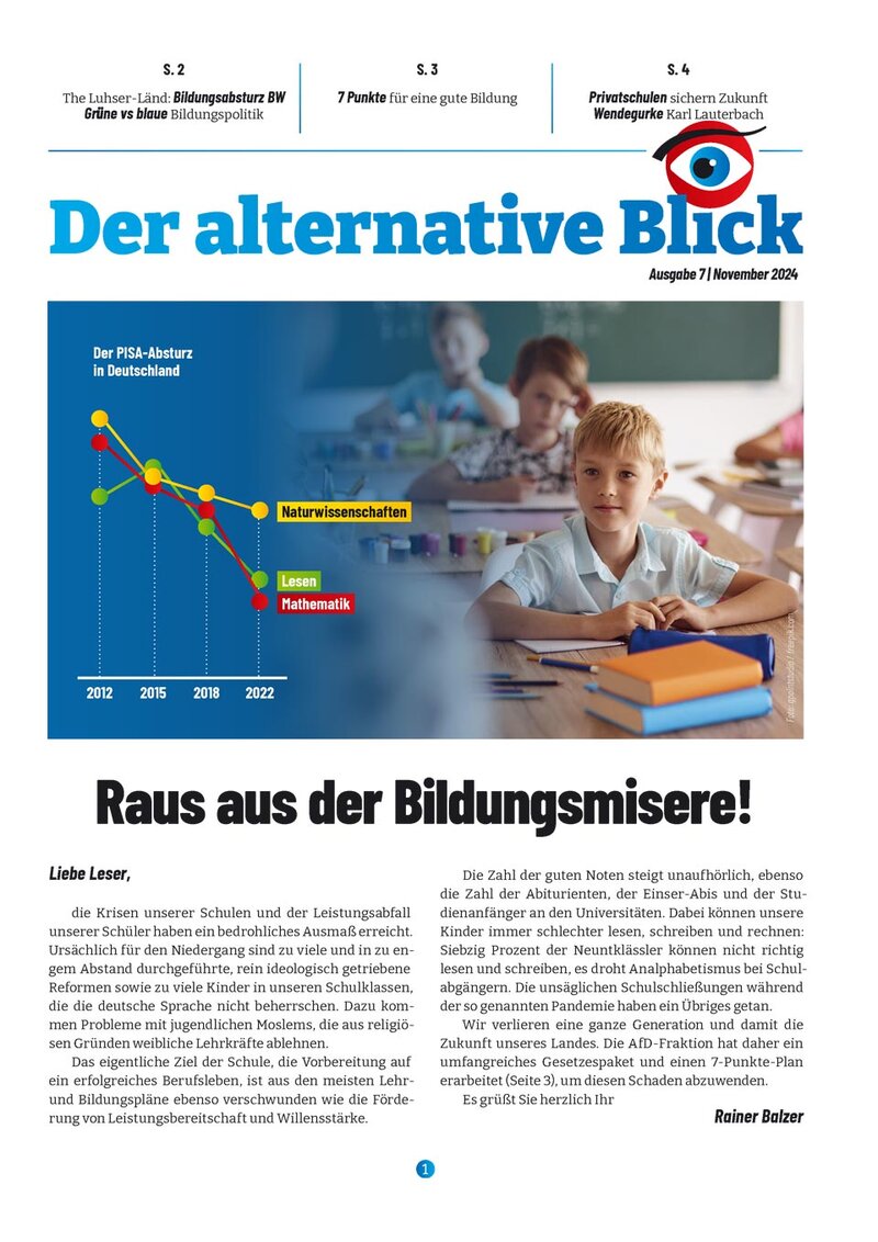 Wir verlieren eine ganze Generation und damit die Zukunft unseres Landes. Die AfD-Fraktion hat daher ein umfangreiches Gesetzespaket und einen 7-Punkte-Plan erarbeitet (Seite 3), um diesen Schaden abzuwenden.
